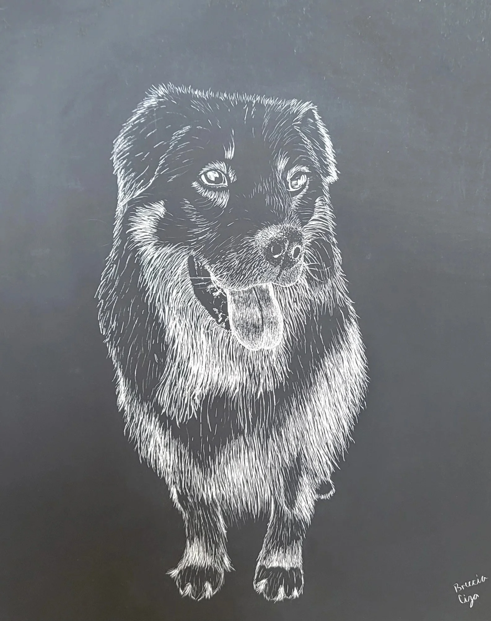 For “Bandit” I used Scratch paper. The paper itself was black, and I had to remove it with a wooden pen to reveal the white, or the highlights, of the piece. I chose to do my grandmother’s dog because he means a lot to me. All of the white parts I created on his hair are the light brown spots on his hair, while all the black spots are where he is black.
